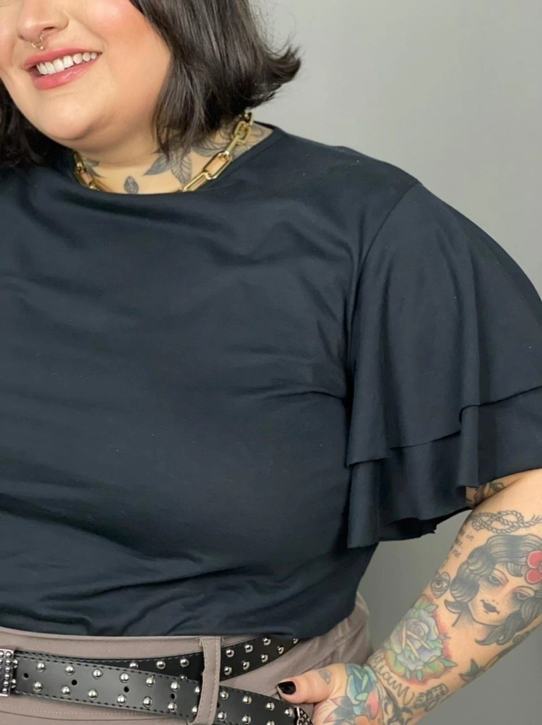 Blusa produzida em tecido 100% algodão com duas camadas de babados na manga.